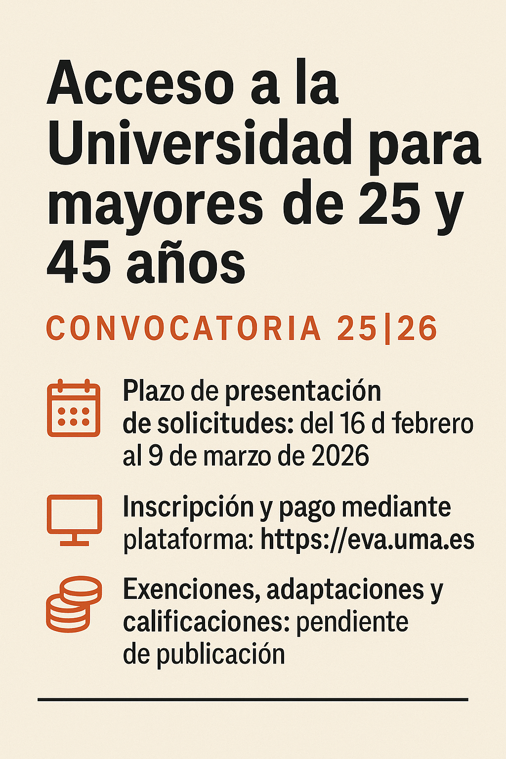 La Universidad de Málaga ha publicado la convocatoria oficial para las pruebas de acceso a la universidad dirigidas a mayores de 25 y 45 años correspondiente al curso 2025/2026. Se trata de una excelente oportunidad para aquellas personas que desean iniciar estudios universitarios y no cuentan con los requisitos académicos convencionales.