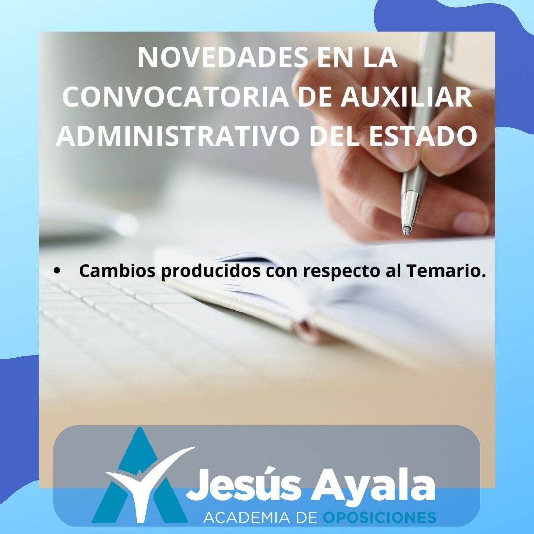 Desde la Academia de oposiciones Jesús Ayala, y tras un análisis por parte de nuestros docentes de la convocatoria de Auxiliar Administrativo del Estado publicada 27 DE ENERO 2023 , queremos informaros de los cambios habidos en la misma con respecto a convocatorias de años anteriores por lo que respecta al temario.