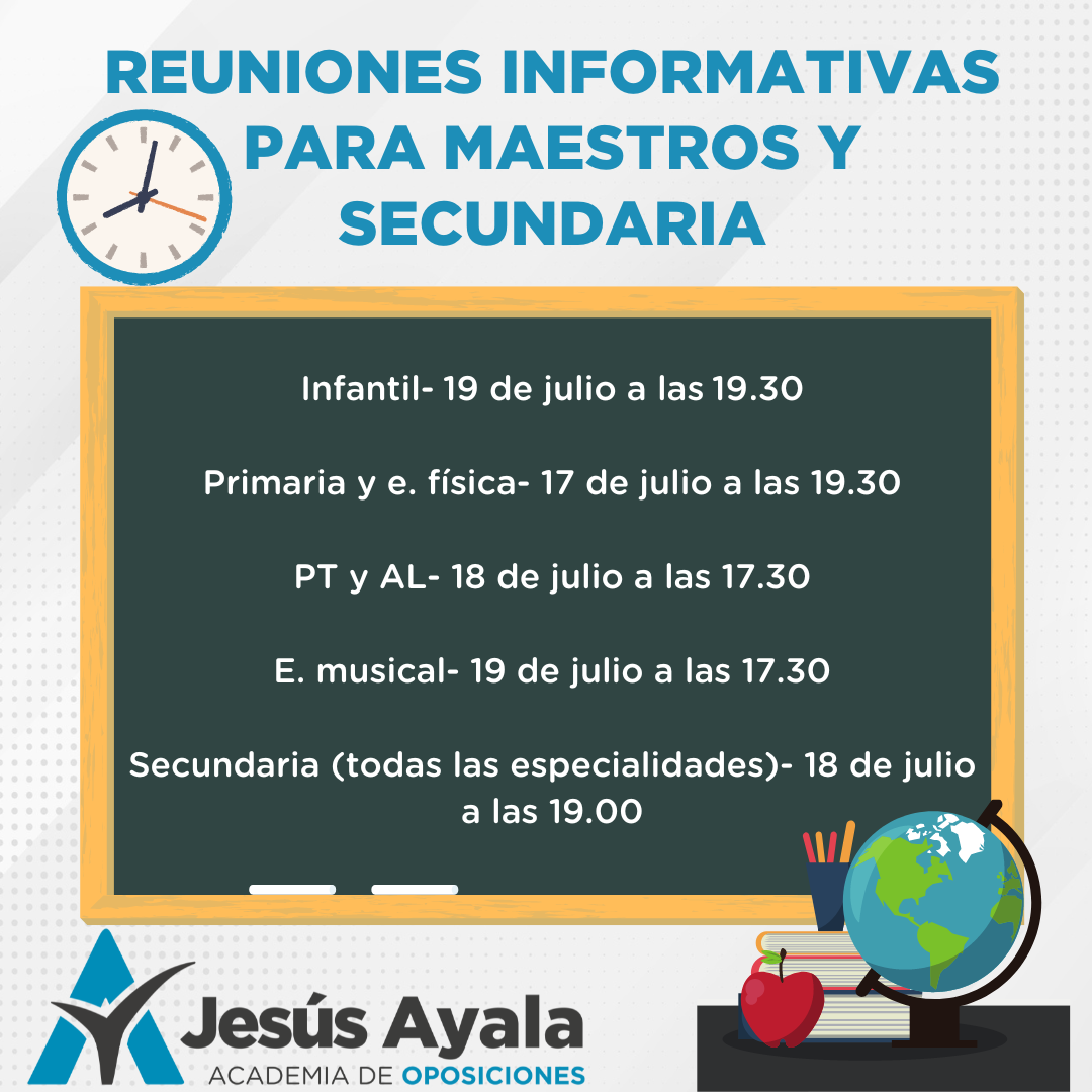Durante la próxima semana tendremos varias reuniones informativas para explicar el funcionamiento de todas las especialidades que vamos a preparar de las oposiciones de Secundaria y Maestros/as de Andalucía 2023-24.