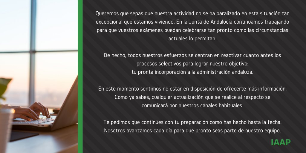 2) Oposiciones de la Junta de Andalucía. Información del IAAP: Suspensión Temporal (2 meses, en principio): Afecta a Auxiliares Administrativos de la Junta, Administrativos de la Junta, A1/A2 de la Junta, Trabajo Social de la Junta y Agentes de Medio Ambiente.