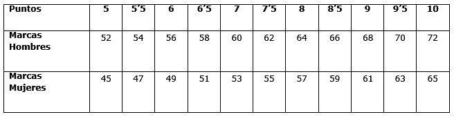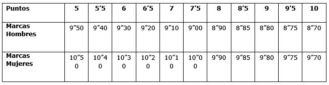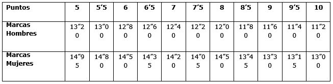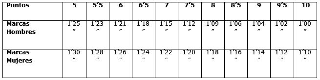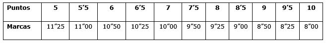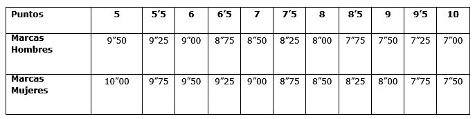 Puntuación: Se otorgará según la siguiente escala (tiempo en segundos, décimas y centésimas).