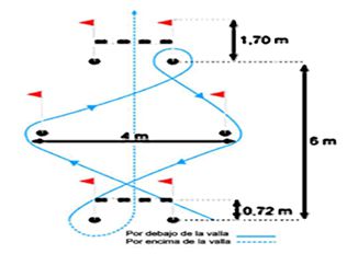 Descripción: Consistirá en la realización del circuito que se indica, se utilizarán dos picas de entre 1,60/1,70 m de altura, mantenidas verticalmente por la correspondiente base y dos obstáculos tipo valla con una altura de 0,72 m, desde el suelo a la parte inferior del listón, y prolongada verticalmente por dos picas, que tienen las mismas características de las anteriormente citadas.