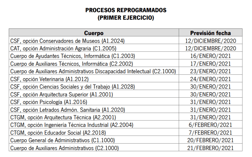 El Instituto Andaluz de Administración Pública ha procedido a la reprogramación de forma coordinada con las comisiones de selección de los primeros ejercicios de los cuerpos que se encontraban pendientes de realización a esa fecha, en atención a los nuevos requerimientos en materia de salud pública.
