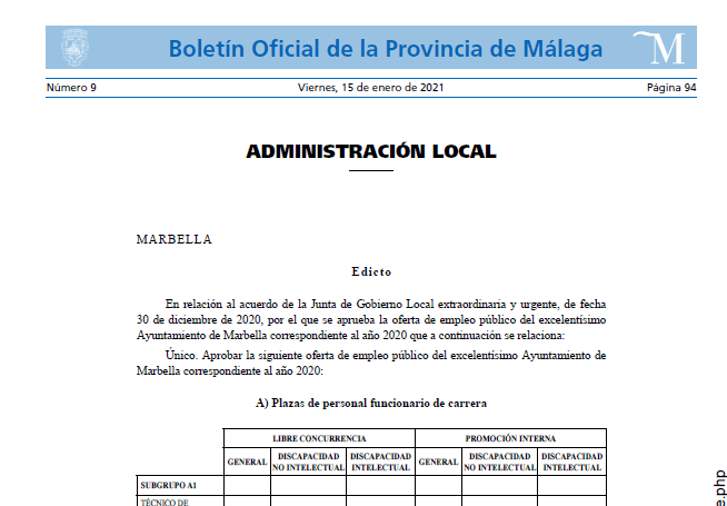 En el día 15 de enero de 2021, el Boletín Oficial de la Provincia de Málaga, recoge la publicación de la oferta de empleo público de la ciudad de Marbella, con varias plazas de personal funcionario y de personal laboral.