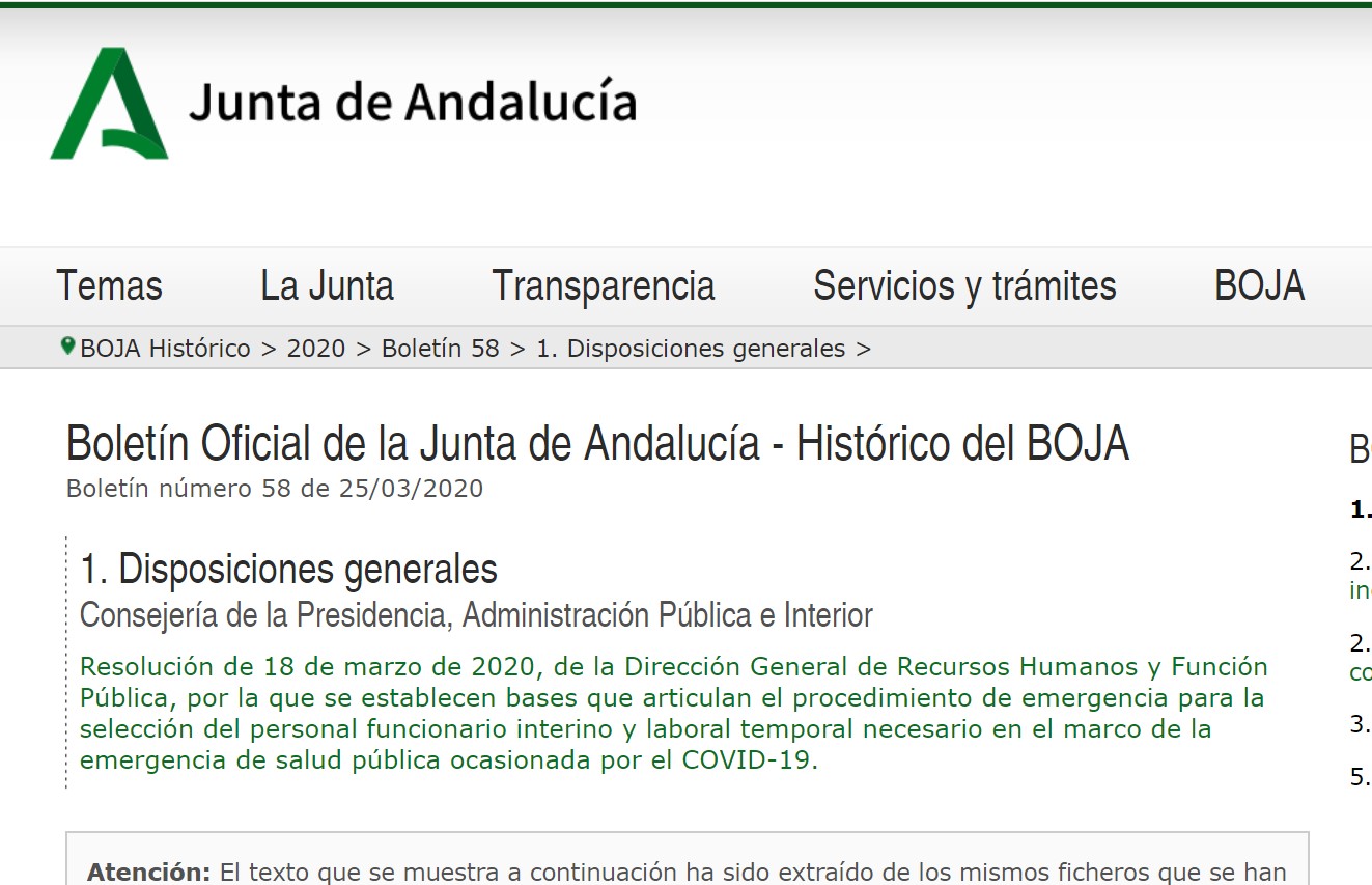 En el Boletín Oficial de la Junta de Andalucía, se publica el miércoles 25 de marzo del 2020, la resolución e la Dirección General de Recursos Humanos y Función Pública, por la que se establecen bases que articulan el procedimiento de emergencia para la selección del personal funcionario interino y laboral temporal necesario en el marco de la emergencia de salud pública ocasionada por el COVID-19.